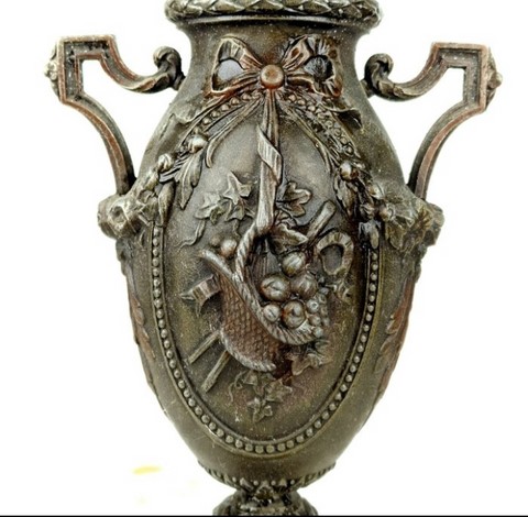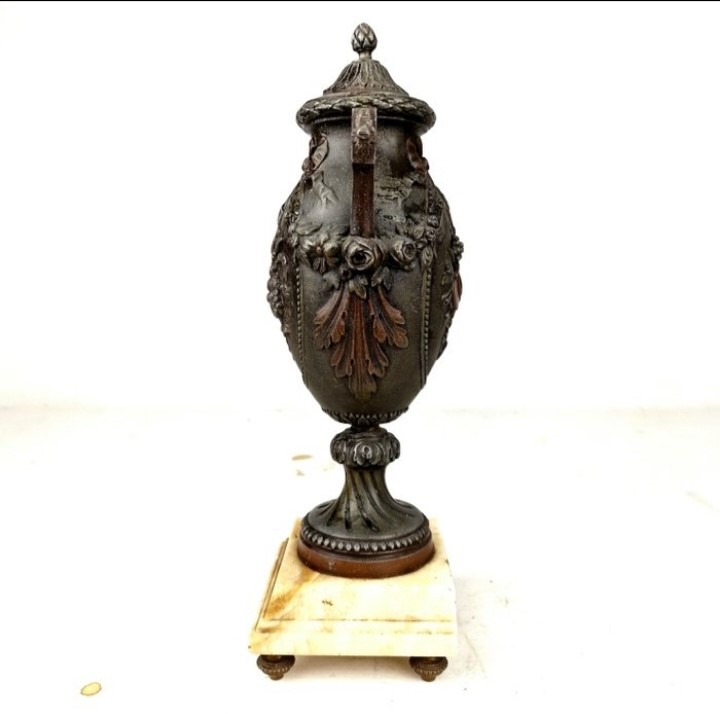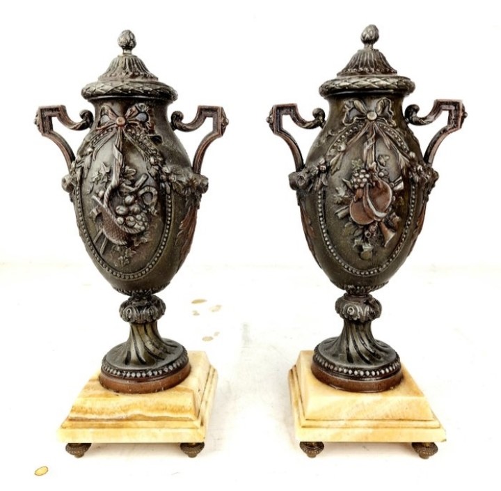 Paire de vases d'ornement de cheminée en régule style louis XVI sur socle en marbre.